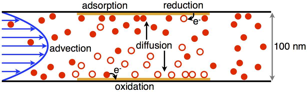 Nanofluidic thin-layer cells based on redox cycling allow for extremely sensitive electrochemical detection. Here we establish a physical mass-transfer model for analyte molecules in these transducers which takes into account advective and diffusive transport of both oxidized and reduced species as well as reversible dynamic adsorption at the sensor surfaces. We use finite-element modeling to determine the transient response of nanogap sensors; numerically we predict that the response time can be reduced substantially by pressure-driven advection while the faradaic limiting current remains unaffected by this flow for all experimentally accessible flow rates.