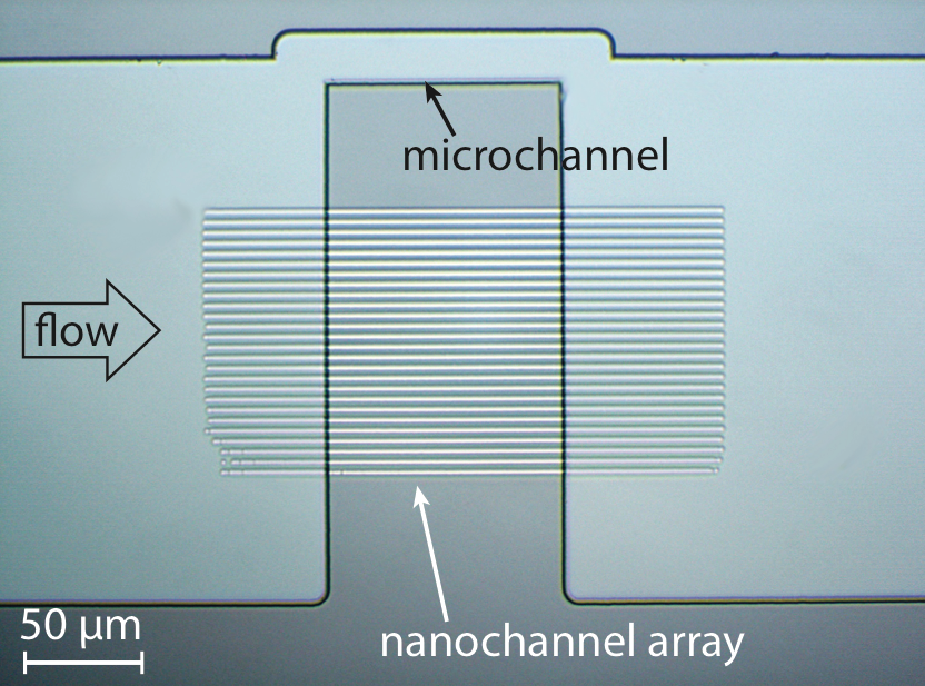 This paper introduces a novel fluidic device based on syringe-driven flow of fluorescent species through a parallel array of nanochannels, in which the geometrical confinement enables long observation times of non-immobilized molecules. Extremely low flow rates are achieved by operating the array of nanochannels in parallel with a larger microchannel. The addition of a second microfluidic inlet allows for mixing different species in a well-defined volume, enabling the study of irreversible reactions such as DNA synthesis in real-time using single-molecule fluorescence resonance energy transfer. Devices are fabricated in glass with the purpose of high-throughput single-molecule fluorescence detection.