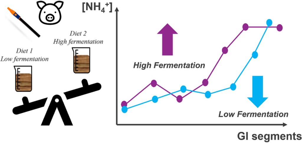 The correlation between nutritional habits and gut health directly impacts the gut-brain axis via a complex and not yet fully disclosed communication network. Establishing a link between our food intake and specific physiological responses as well as a better knowledge of diseases and the gut microbiota involves solving a challenging puzzle of biochemical pathways. Our understanding is limited by the inaccessibility of the gastrointestinal region to routine non-invasive chemical analysis. Here, we move a step further toward the direct assessment of a protein fermentation product, i.e., ammonium ions, via ion selective electrodes (ISEs) in gastrointestinal digesta samples. By modulating the digestible protein content of the diet regimes of two groups of pigs, we discriminate the level of protein fermentation with a straightforward quasi in-vivo detection method which does not require any sample preparation. Our results show more than a 2-fold increase in ammonium ion concentration (from 180 ppm to 400 ppm) in the proximal colon for a diet based on poorly digestible proteins compared with a diet based on easily digestible proteins. Our approach shows good correlation with a standard laboratory technique for the determination of NH4+, i.e., the Indophenol Blue Method. Our results show the direct sensing of a protein fermentation product in real matrix and demonstrate the great potential of potentiometric sensors to assess ammonium concentration profile along the gastrointestinal tract for diets varying in protein digestibility and fermentation.