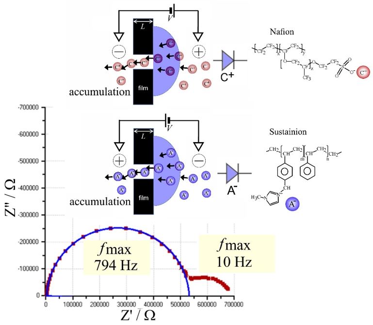 Sulfonated poly(oxy-1,4-phenylene-oxy-1,4-phenylenecarbonyl-1,4-phenylene) also known as SPEEK is a chemically robust cation conductor with good solution processability. A thin film (approx. 0.7 μm) coated asymmetrically over a 10 μm diameter microhole in a Teflon substrate film (5 μm thickness) produces ionic diode effects in aqueous electrolyte media even at high ionic strengths up to 2 M NaCl. The enhancement in the ionic diode performance under high salt conditions is tentatively attributed to a (partial) switch from a concentration polarisation effect (dominant for high diode currents) to interfacial polarisation (dominant at low current; proposed for molecularly rigid ionomers). Ionic strength effects on the diode performance seem relatively low further indicative of a mechanism for the diode effect caused by interfacial polarisation without significant concentration polarisation. Preliminary comparison of diode phenomena in aqueous HCl, LiCl, NaCl, and MgCl2 reveals cation specific effects due to interaction with the polymer.